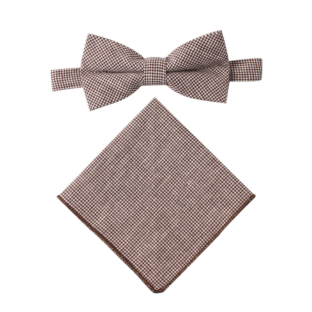 The Brown Mini Houndstooth Cotton Bow Tie & Pocket Square Set is a refined accessory that combines classic patterning with modern charm. Crafted from premium cotton, its subtle houndstooth design in warm brown tones adds depth and sophistication to any outfit. Perfect for weddings, formal gatherings, or professional wear, this set brings timeless elegance with a contemporary twist.